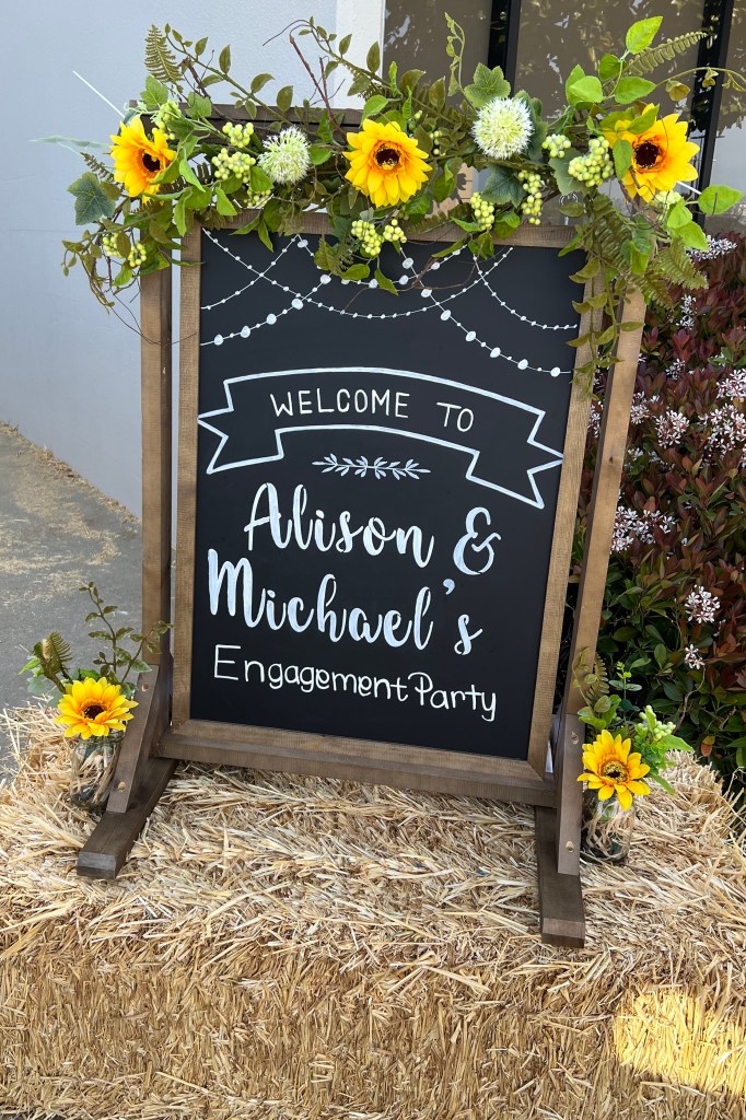 - Welcome swinging chalkboard sign XL 30x40in with calligraphy and floral arrangement = $250